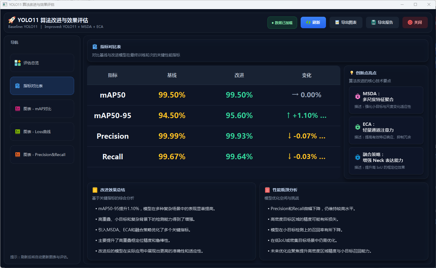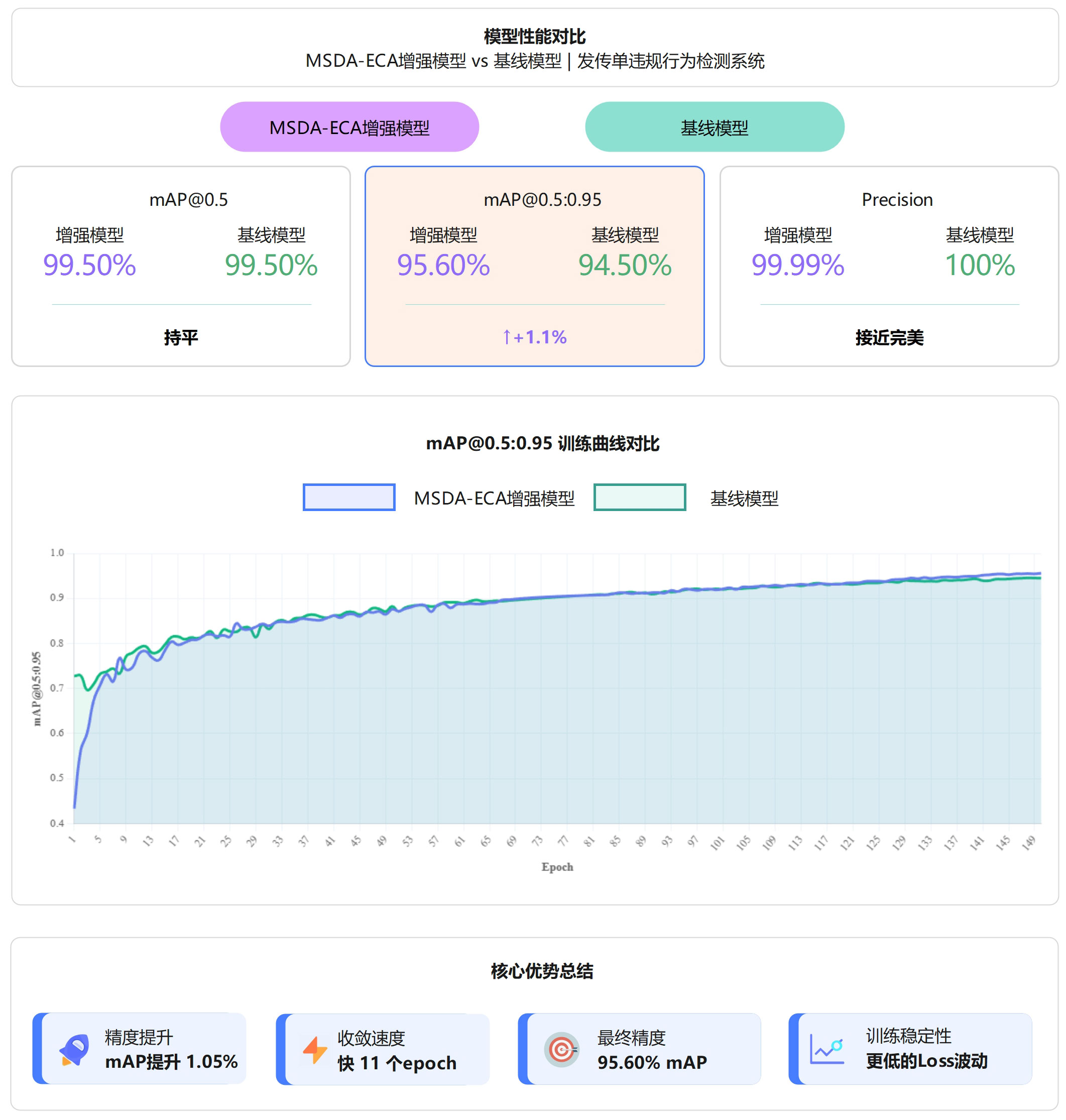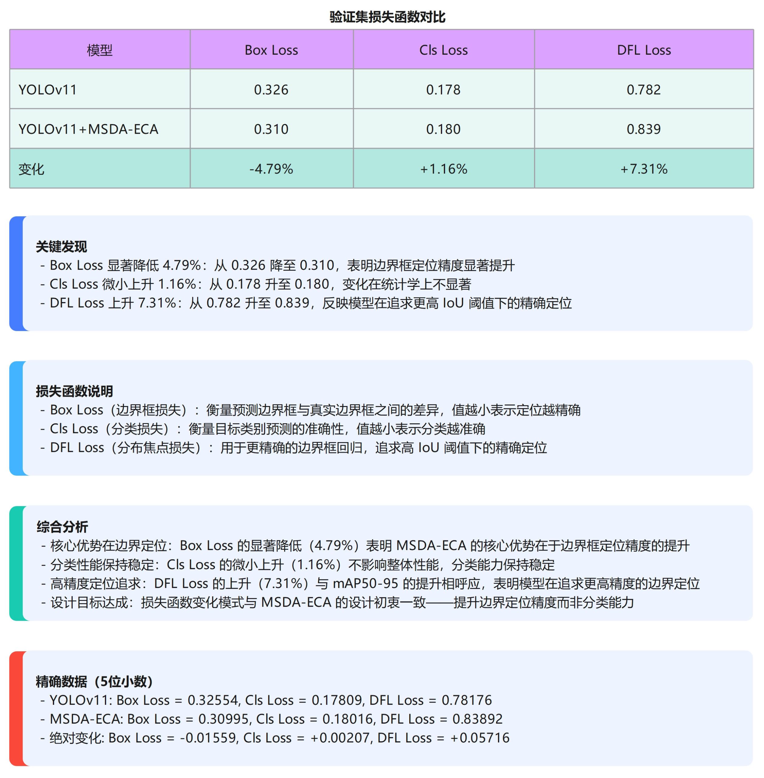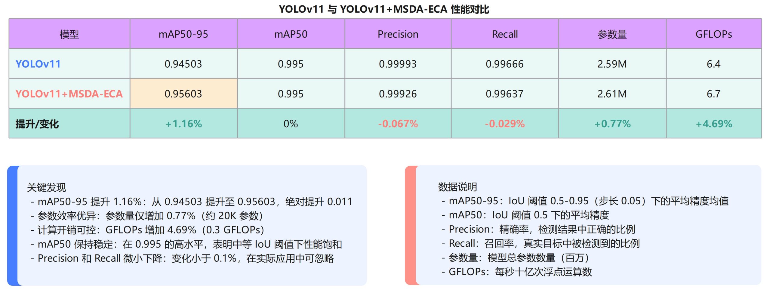 综合来看,双模型对比实验充分验证了 MSDA-ECA 模块的有效性。该模块在保持极低的参数和计算开销的前提下,显著提升了检测精度,特别是在高 IoU 阈值下的边界定位精度。同时,模块的引入并未影响模型的训练稳定性,反而加速了收敛过程,展现出良好的工程实用价值。