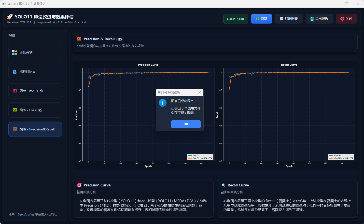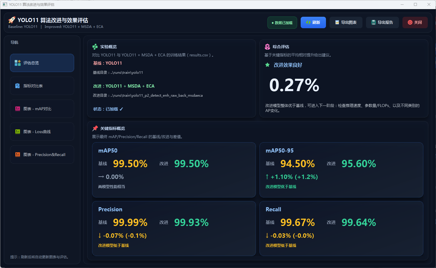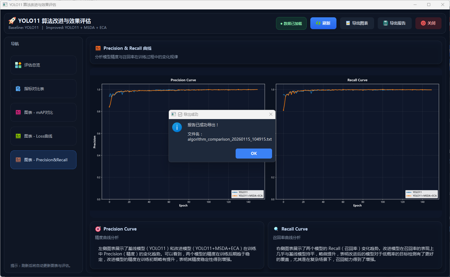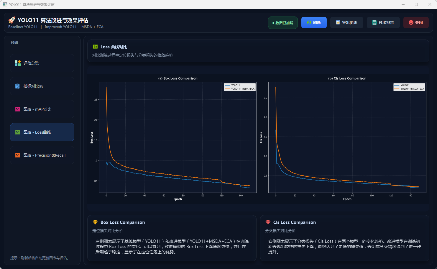 综合来看,双模型对比实验充分验证了 MSDA-ECA 模块的有效性。该模块在保持极低的参数和计算开销的前提下,显著提升了检测精度,特别是在高 IoU 阈值下的边界定位精度。同时,模块的引入并未影响模型的训练稳定性,反而加速了收敛过程,展现出良好的工程实用价值。