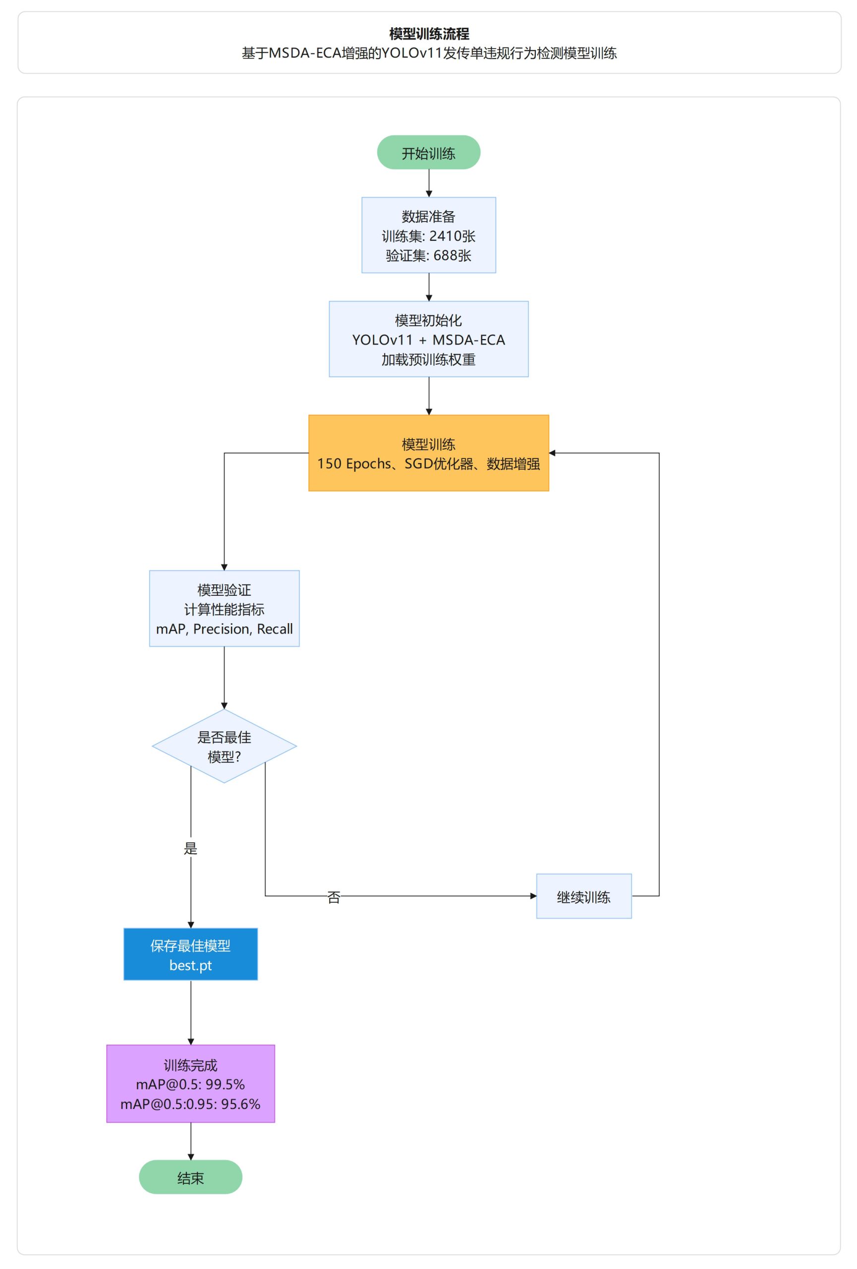 模型训练采用端到端的方式,首先加载训练集和验证集进行数据预处理,然后加载YOLOv11预训练权重并集成MSDA-ECA增强模块进行模型初始化,接着使用SGD优化器进行150轮迭代训练,每轮训练后在验证集上评估性能指标,系统自动保存验证集上性能最佳的模型权重,最终输出完整的性能指标和训练曲线。
