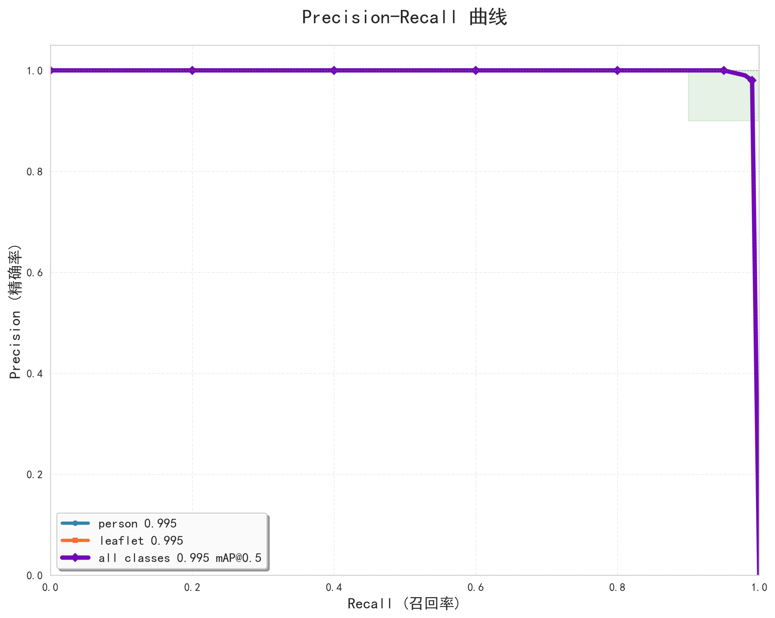 展示模型在不同置信度阈值下的精确率和召回率关系,all classes mAP@0.5达到0.995