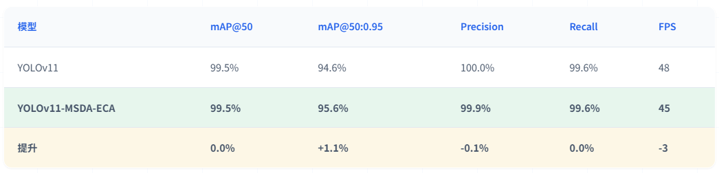 检测精度指标: mAP50-95 是目标检测任务中最重要的综合评价指标,衡量模型在不同 IoU 阈值(0.5 到 0.95,步长 0.05)下的平均精度。MSDA-ECA 模型在该指标上从 0.94503 提升至 0.95603,提升 1.16%,表明模型不仅能准确识别目标,还能精确定位边界。mAP50 保持在 0.995 的高水平,说明模型在宽松 IoU 阈值下已达到接近完美的性能。