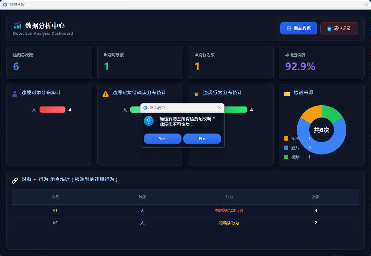数据分析模块提供检测数据的可视化展示和统计分析功能,用户点击"数据分析"按钮打开独立的分析窗口,可查看今日检测次数、今日告警次数、累计检测数、违规次数、人员检测数、传单检测数等关键统计指标,通过条形图、统计卡片等形式直观展示数据分布,支持查询历史检测记录(存储在 SQLite 数据库 data/app.db)、导出 CSV 格式报告、清空当前用户记录等操作,实现检测数据的持久化存储和全面分析。