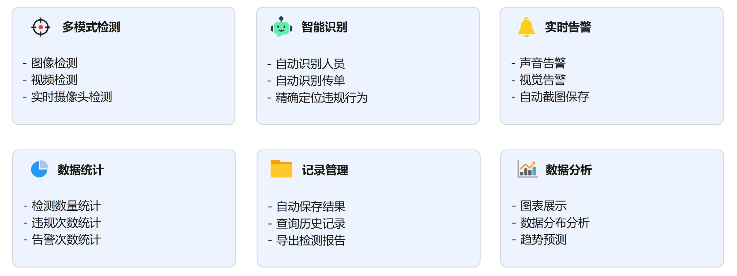 本系统提供图像、视频、实时摄像头三种检测模式,集成智能识别、实时告警、数据统计、记录管理和可视化分析功能,实现公共区域违规发传单行为的全流程智能监测与管理。