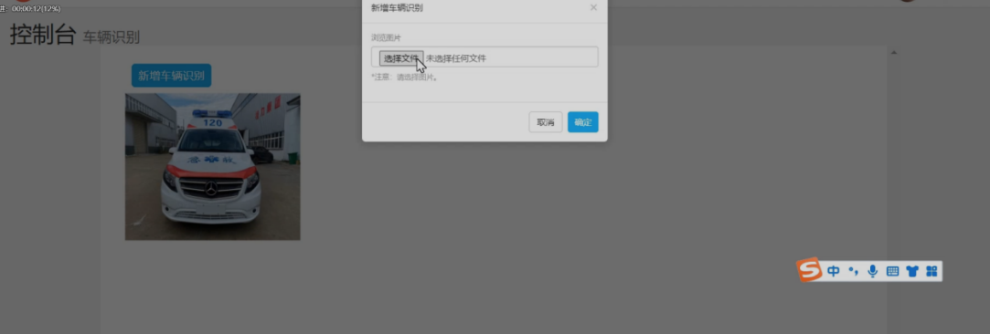 在进入到车辆识别的菜单中,可以看到当前系统中已经存在的上传过的图片信息。用户想要进行新的车辆识别可以点击"新增车辆识别"的按钮,系统会弹出一个新的对话框,在对话框中能够进行文件的上传,再上传完文件后可以再对图片进行分析