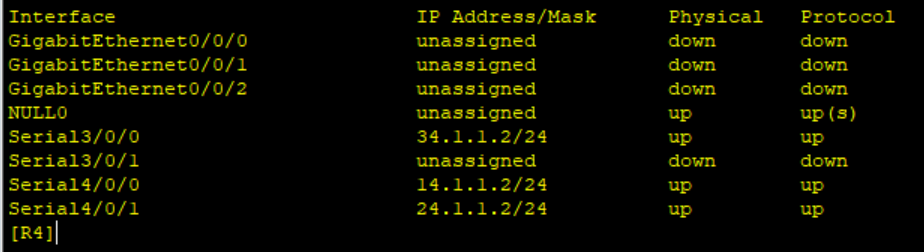 R4:上已经有了R1,R2,R3的路由条目,所以只需要配置缺省路由指向R4即可。
