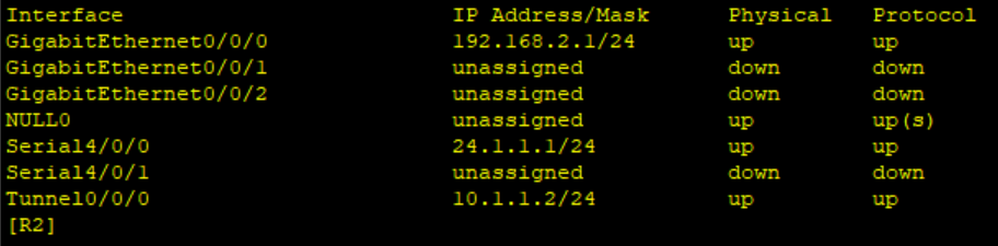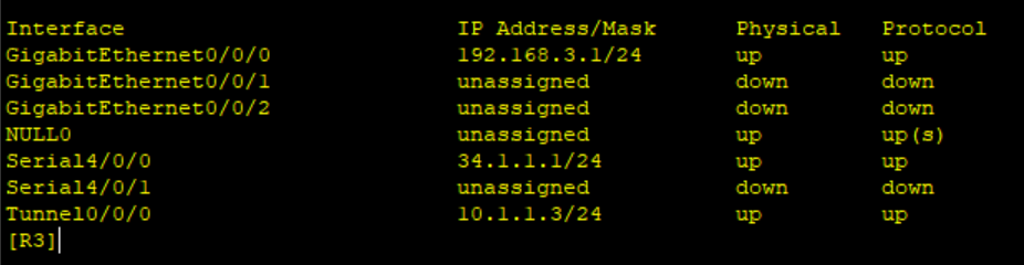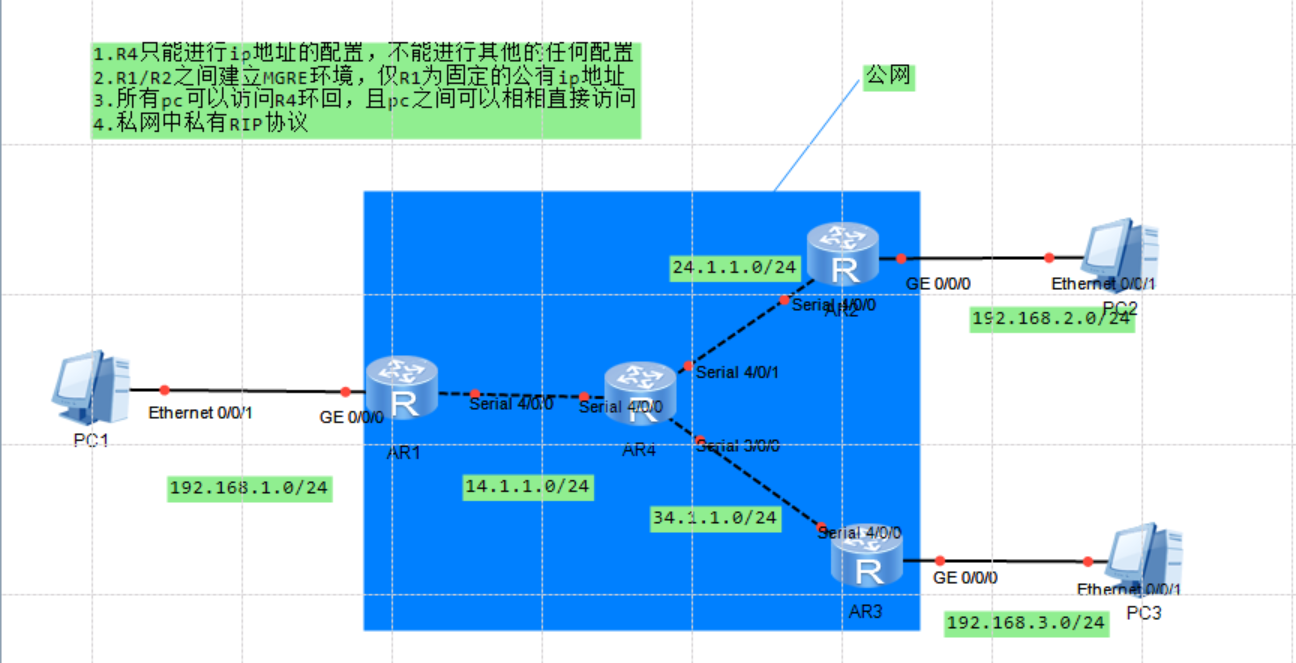 r1\]ip ad 0.0.0.0 0 14.1.1.2 \[r2\]ip ad 0.0.0.0 0 24.1.1.2 \[r3\]ip ad 0.0.0.0 0 34.1.1.2 这样缺省就配置好了 ### 3.进行nat配置 因为要上网,所以要配置nat(私网转化为公网) \[R1\]acl 3000 \[R1-acl-adv-3000\]rule permit ip source 192.168.1.0 0.0.0.255 \[R1\]int s4/0/0 \[R1-Serial4/0/0\]traffic-filter outbound(出接口) acl 3000 这样就能上网了 在R2,R3上也是这杨配置就行 ### 4.进行mgre配置 目的:pc1可以直接ping通pc2和pc3 主路由器配置 \[R1\]int t0/0/0 \[R1-Tunnel0/0/0\]ip ad 10.1.1.1 24 \[R1-Tunnel0/0/0\]tunnel-protocol gre p2mp \[R1-Tunnel0/0/0\]source 14.1.1.1 \[R1-Tunnel0/0/0\]nhrp entry multicast dynamic \[R1-Tunnel0/0/0\]nhrp network-id 100 次路由器配置 \[R2\]int t0/0/0 \[R2-Tunnel0/0/0\]ip ad 10.1.1.2 24 \[R2-Tunnel0/0/0\]tunnel-protocol gre p2mp \[R2-Tunnel0/0/0\]nhrp entry 10.1.1.1 14.1.1.1 register \[R1-Tunnel0/0/0\]nhrp network-id 100 R3也是这样的配置,我就不写了。 ### 5.补充路由条目  这是mgre配置后的虚拟 这里我们可以看到,R1不知道R2后的路由条目,也不知道R3后面的路由条目,同理,R2和R3也不知到R1的,所以我们要在彼此添加相对应的路由条目。 完成所有后我们就可以完成此项任务了。