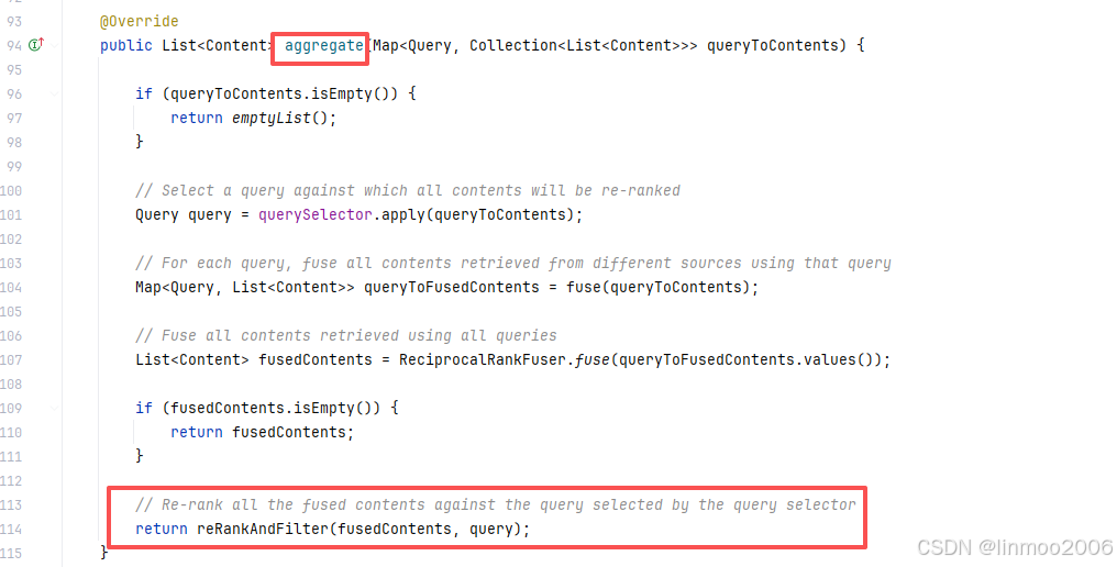 说明 :从结果上看,第一个文档的正相关性为0.66,说明这个文档与query有用度较高。其它3个文档几乎接近0,也就是既没有正相关,也不负相关。通过评分的结果,就可以对文档进行重排名。特别是对于token有限的情况下,重排序只取更有相关性的文档,这样既可以让大模型读取到有用的信息,也可以减少token数量。在前面《Langchain4j 系列之十九 - RAG之Retrieval》章节中关于重排序的 ContentAggregator ,当时没有细讲这个类的实现方式,现在来看看它的实现方式。 ContentAggregator 的aggregate()方法如下,可以看到在第114行代码中调用了reRankAndeFilter()方法,如下图: