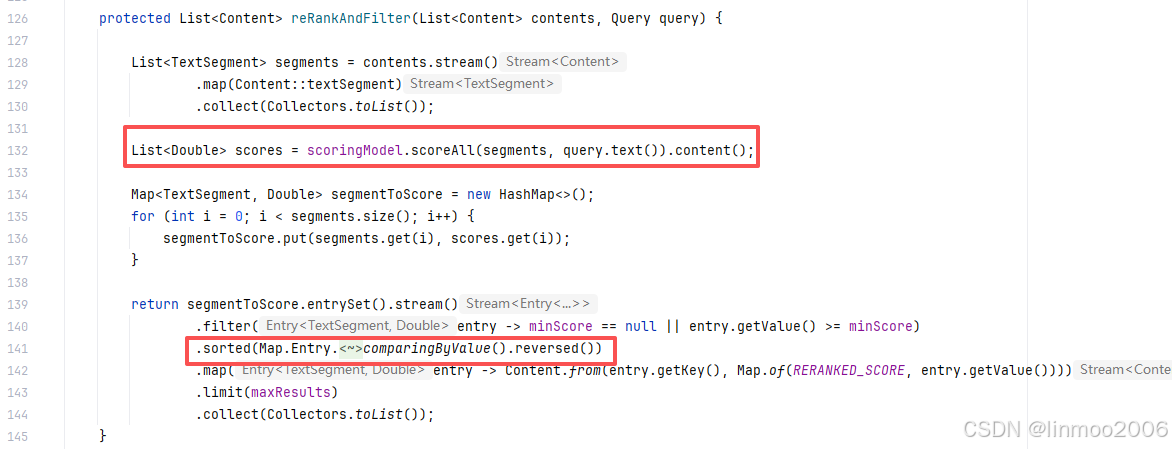 再来看看reRankAndeFilter()方法,可以看到,其调用的就是 ScoringModel 的scoreALL()方法获得评分,然后再进行重排序的。因此这里就可以看出RAG的重排序就是使用 ScoringModel :
