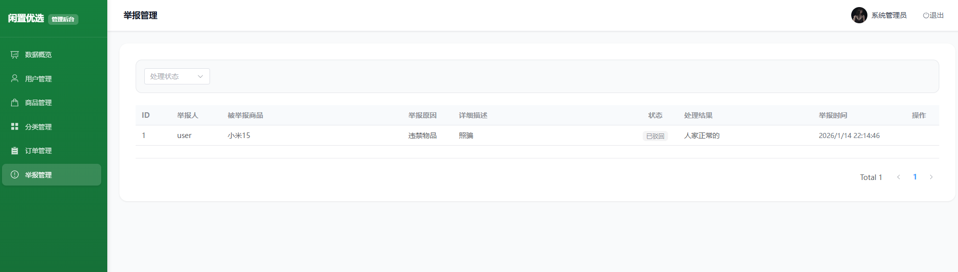 举报模块支持用户对商品提交举报,举报记录包含原因、描述与状态。管理员在后台查看举报列表,对举报进行处理或驳回,并填写处理结果与处理时间。