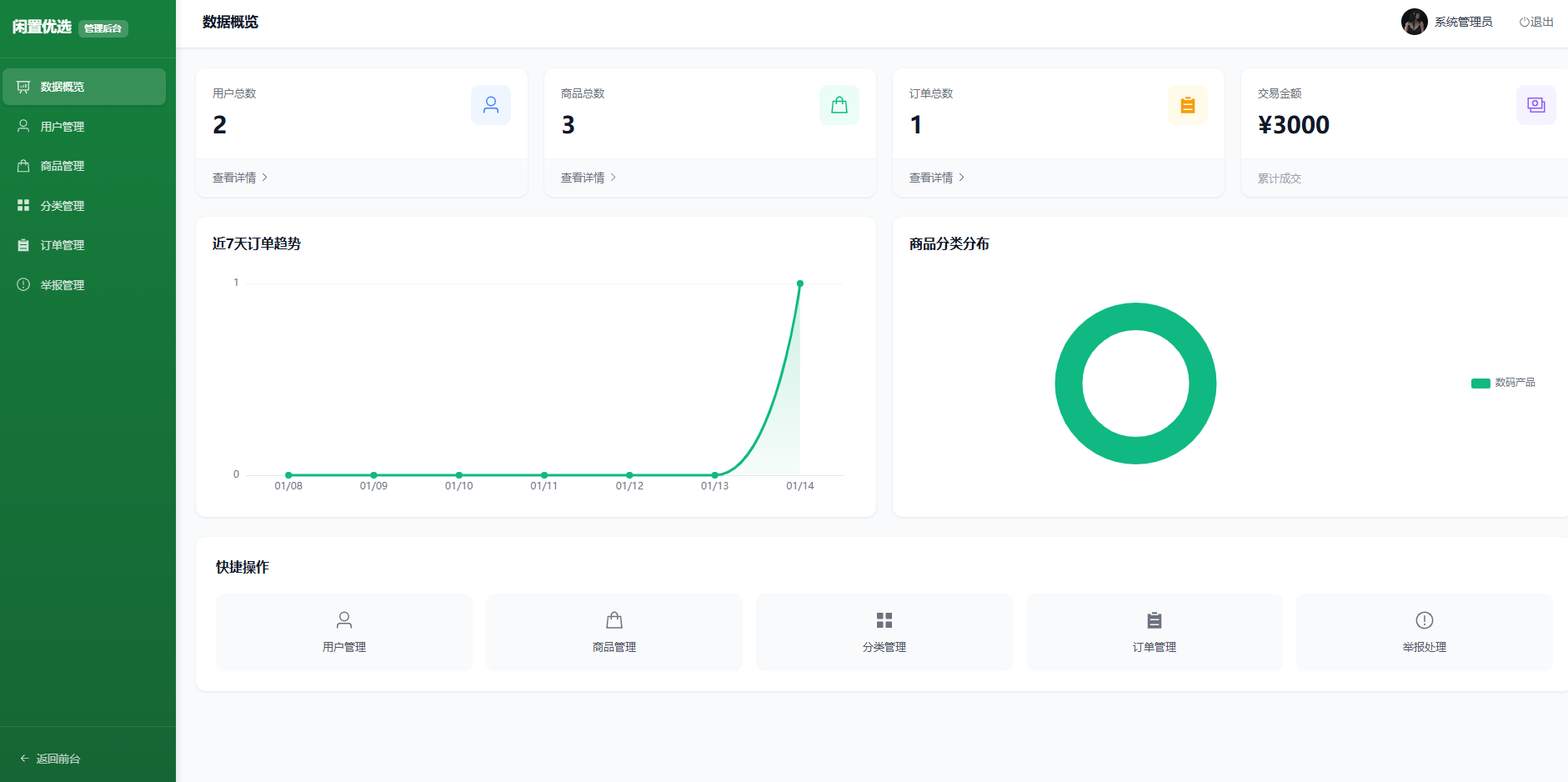 管理员端提供统计数据接口,包含用户数量、商品数量、订单数量与成交总金额。提供近七天订单趋势与分类分布数据接口用于前端图表展示。管理员治理能力包含用户启用禁用、商品审核与强制下架、分类维护、订单删除与举报处理。
