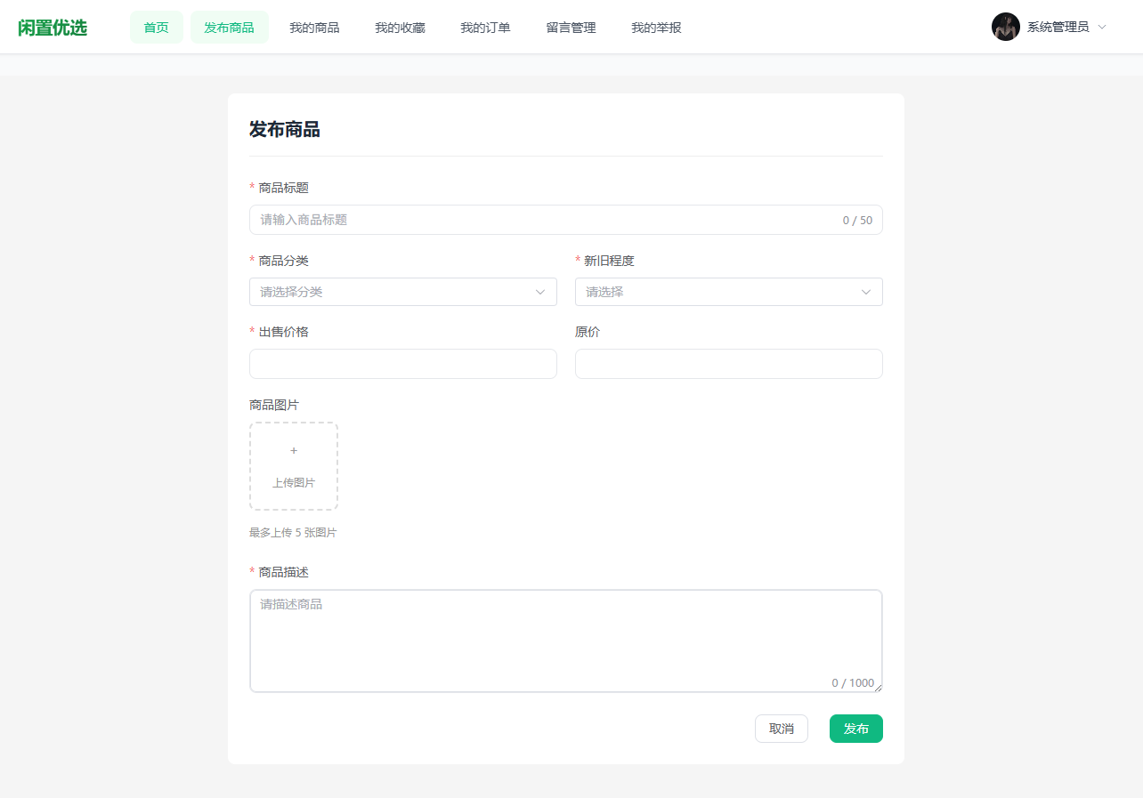 商品发布在三端的交互形态不同,但业务逻辑一致。门户端与小程序端都需要支持填写标题、描述、价格、分类、成色等信息,并支持上传多张图片。后端在保存商品时统一写入发布者标识,并初始化浏览次数等字段,使商品从创建开始具备可展示的基础属性。