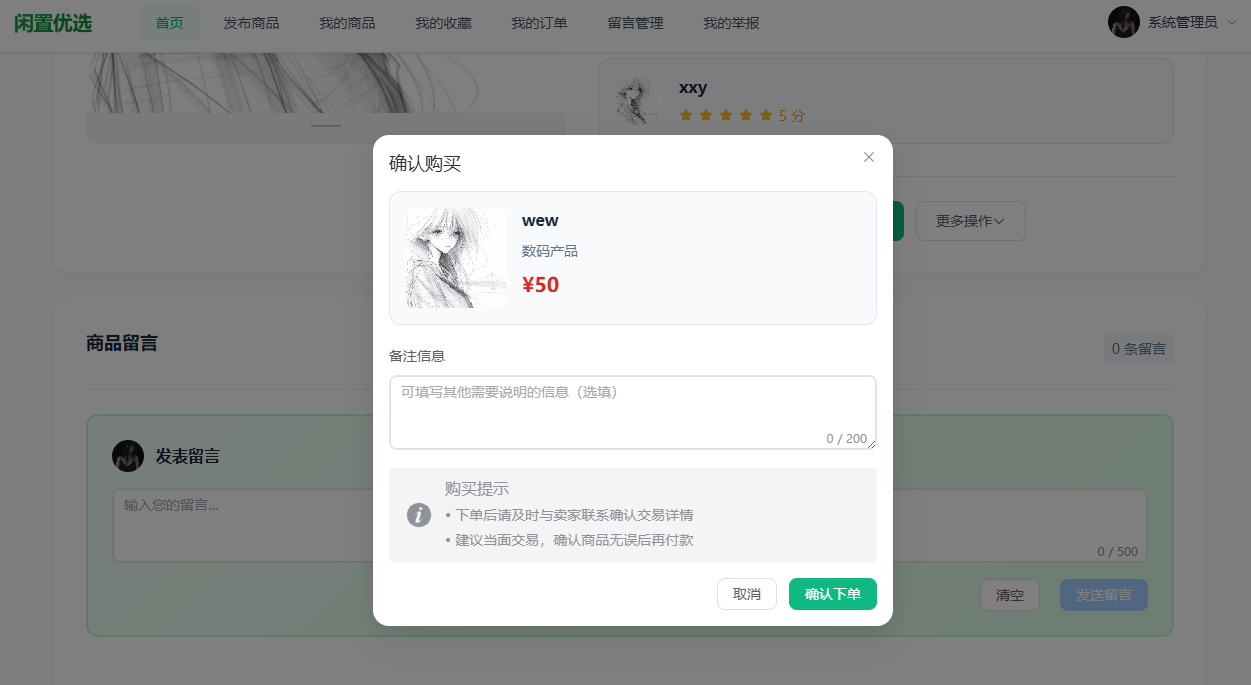 从系统效果看,平台能够满足二手交易场景下的核心需求:一方面为用户提供结构化的信息发布与检索入口,降低信息不对称;另一方面通过订单记录与状态流转提高交易过程可追溯性。同时,管理端治理能力为平台秩序提供保障,能够对违规内容进行集中处理并沉淀处理结果。