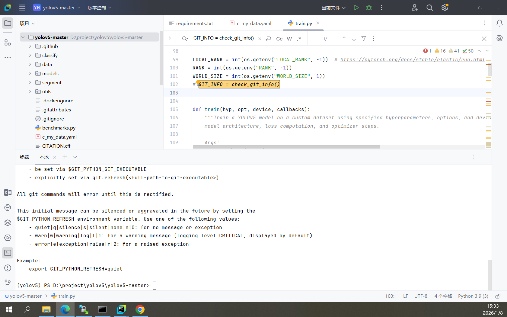 6.打开train.py文件,(是 因为YOLOv5 在启动时尝试检查 Git 信息(用于记录版本),但我电脑没装 Git 或没加到环境变量会出现一个报错)