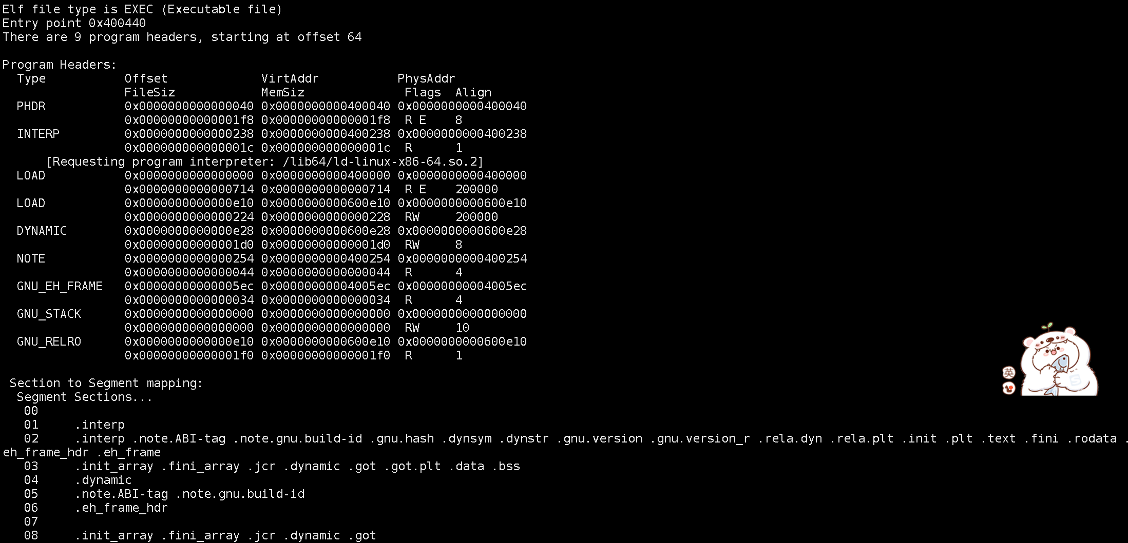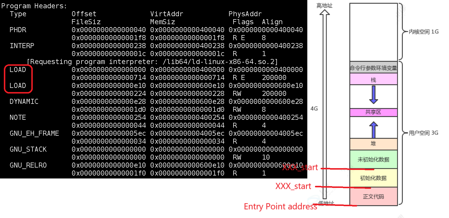 在反汇编查看Program Header Table的内容时,能够发现每个段的内容,在段的Type为LOAD时,这些数据会被用来初始化进程PCB中每个区域的指针。