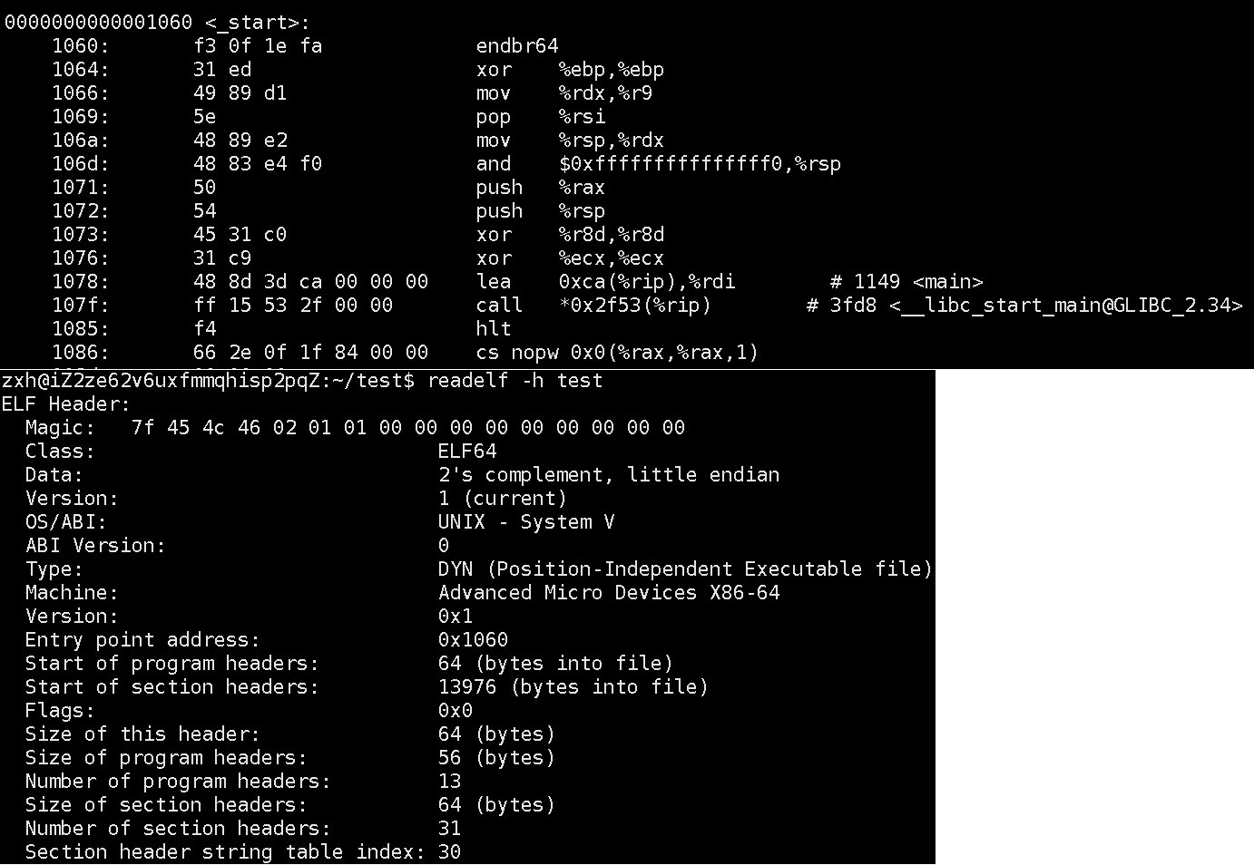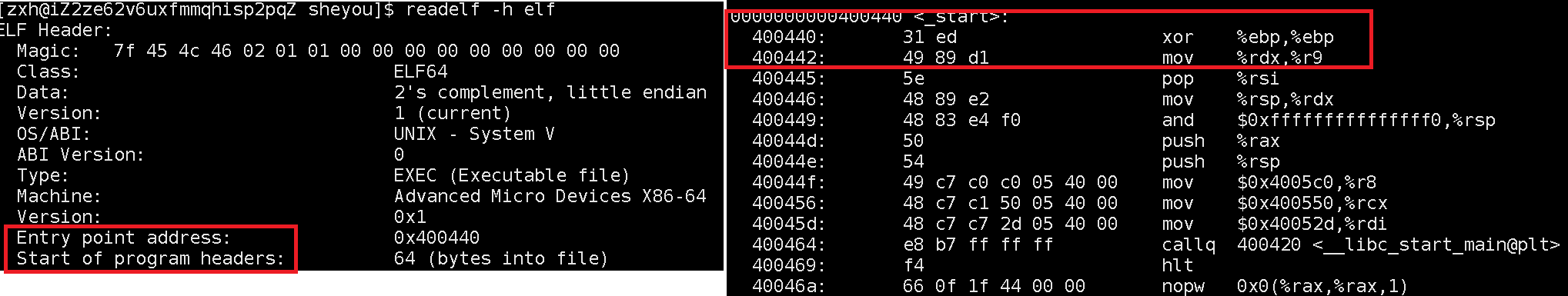 在ELF Header的属性中时,其中有一个Entry point address,标记的是程序进入的位置,在观察节的汇编信息时,其中有一个start节,存储的就是Entry point address的地址,这就是程序运行时运行的第一个位置: