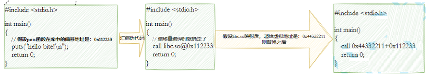 动态链接时call的是GOT表的起始地址+ GOT表的偏移量找到调用的库函数(包含在哪个库中,以及库中的偏移量),随后去共享区找该库函数,找到之后重定位修改代码调用库函数的call无效地址。