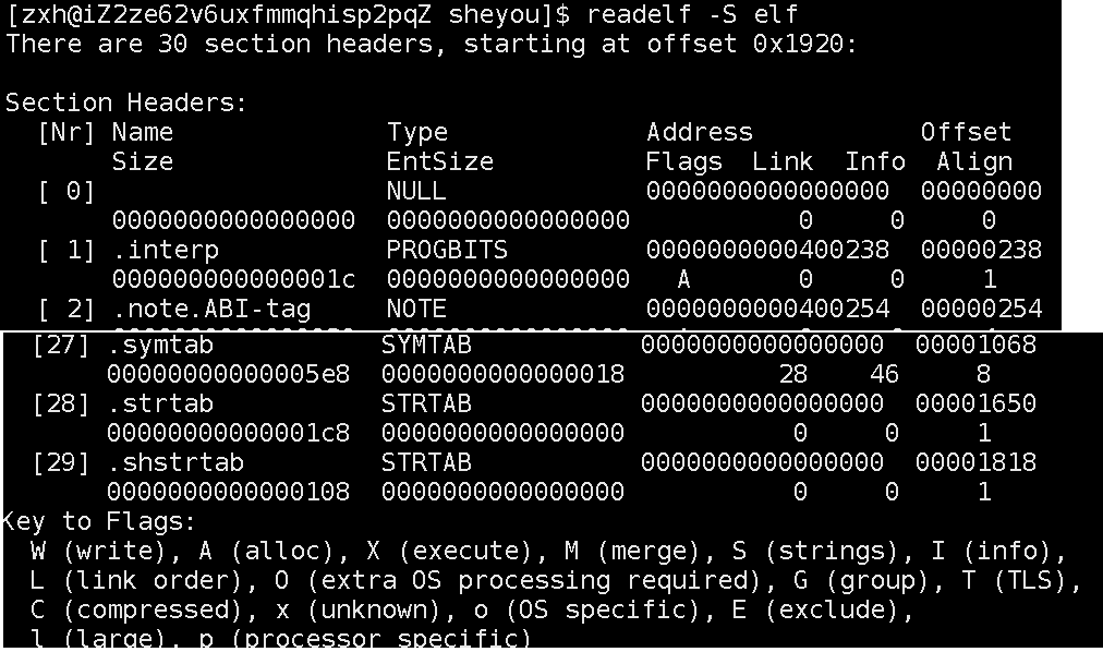 能够发现节总共有30个,下标从0开始,其实节的编号就可以理解为数组的下标。这些节被存储在Section Header Table中。