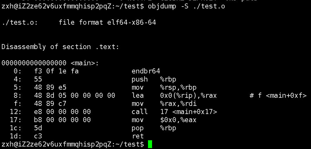 同理,当我们反汇编test.o文件时,call的位置地址是0,因为此时找不到该函数,当静态链接加载库到程序中,能够找到该函数,此时该地址就会被重定向修改为调用函数的虚拟地址。