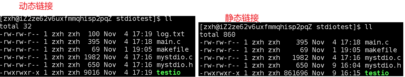 我们来对比一下静态链接和动态链接生成的可执行的差别: