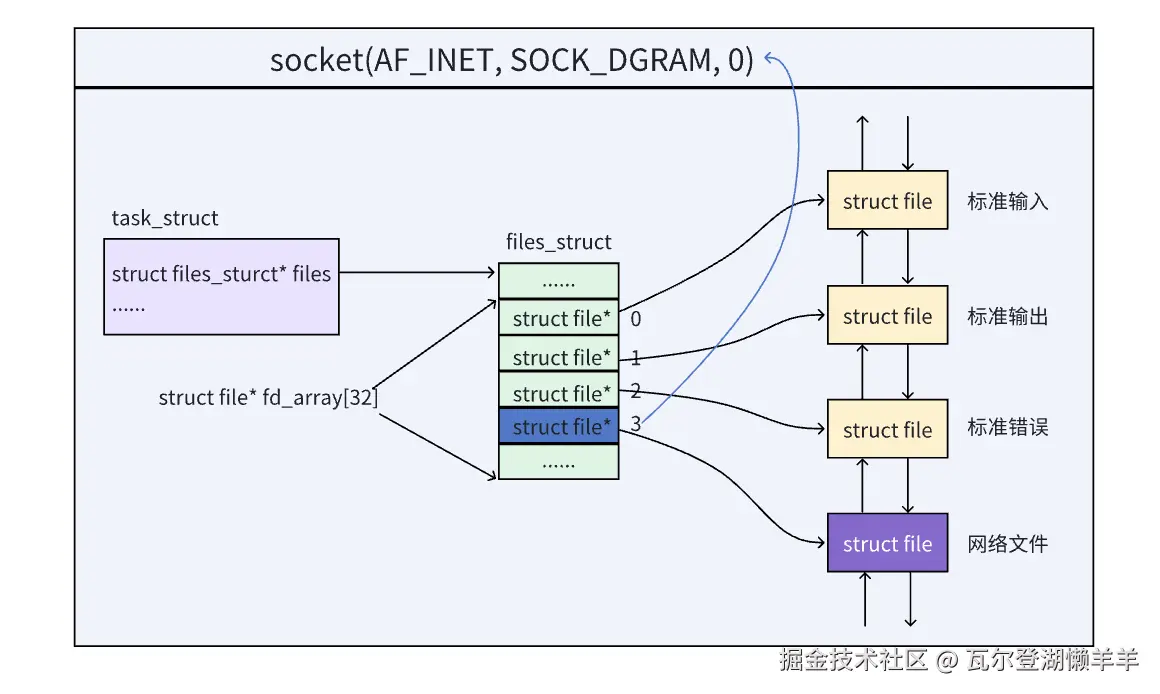 上述问题的关键点就在于要设法将网络文件和普通文件区分开。区分的方法就是,将每一个网络文件对应的 struct file 关联一个 struct sock 结构体(普通文件是没有这个关联的)。而 bind 就是在往这个 struct sock 结构体里面填充信息。 再补充一下,用户可见层看到的只有 struct socket 结构体,也只能往 socket 结构体里面填入用户自己指定的 IP 和 port,但是 bind() 最终是将信息填入内核中的 struct sock 结构体的。