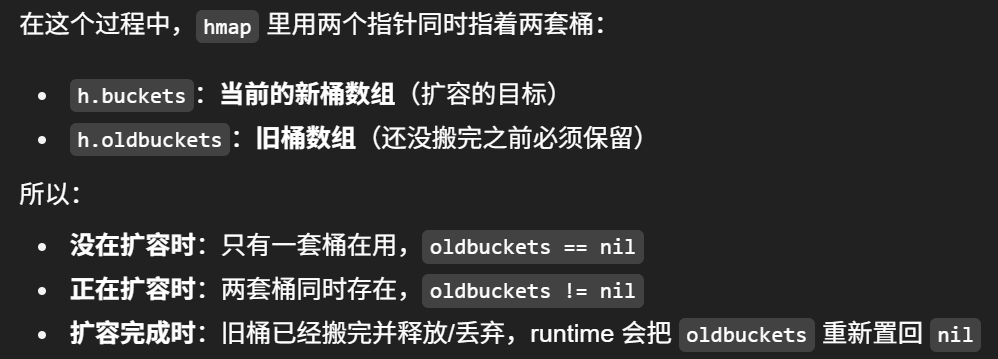 但在很多版本/实现里,如果初始容量很小(典型就是不传 hint),runtime 会采用懒初始化:h.buckets 可能先保持 nil,等到第一次写入(m[k]=v)时才真正分配 buckets。