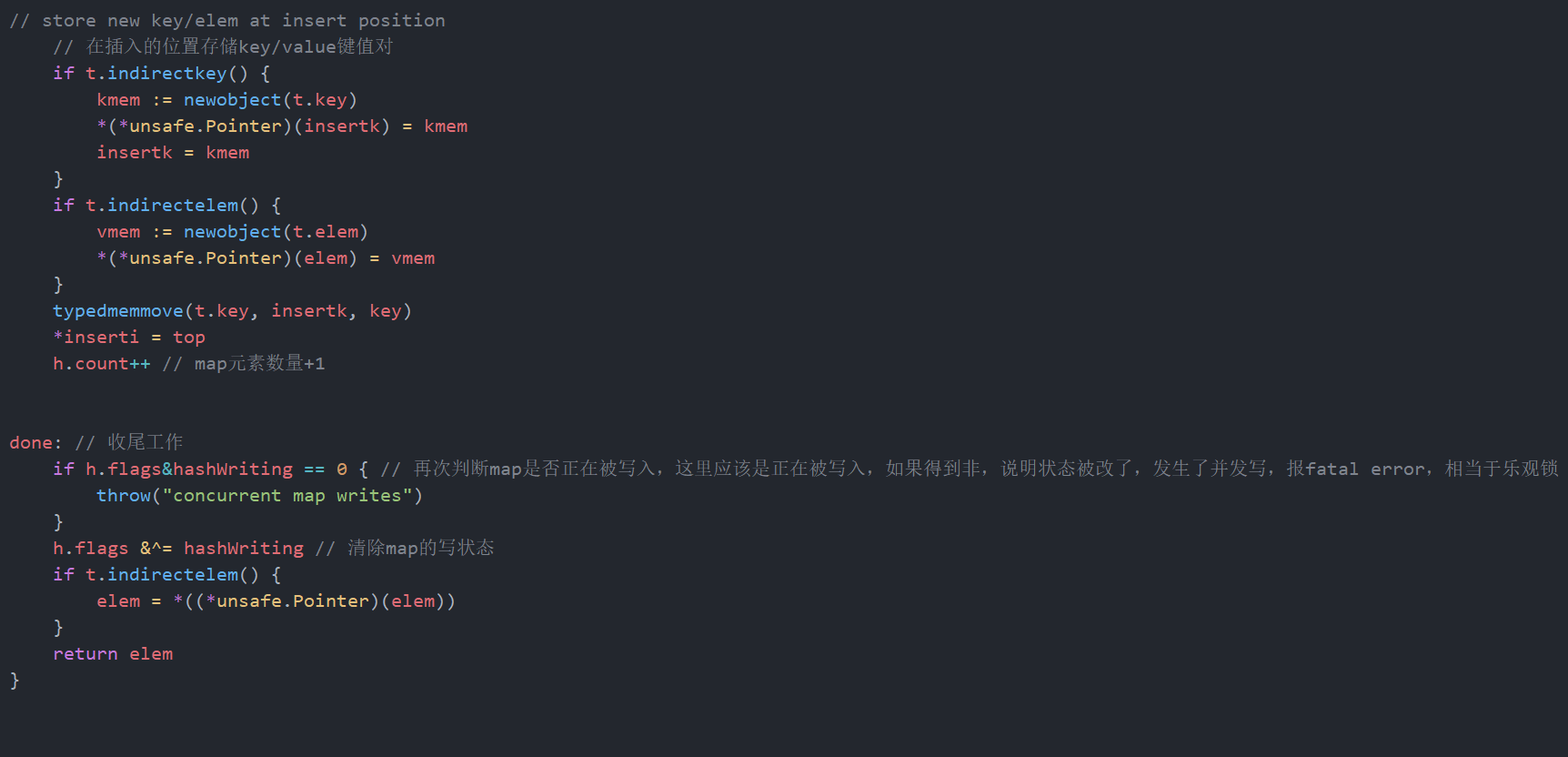 最后,会更新 map 相关的值,如果是插入新 key,map 的元素数量字段 count 值会加 1;在函数之初设置的 hashWriting 写标志出会清零。