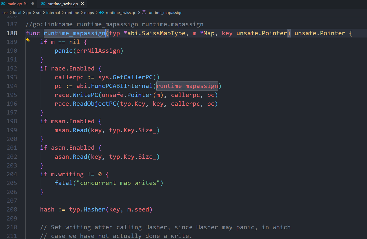 函数首先会检查 map 的标志位 flags。如果 flags 的写标志位此时被置 1 了,说明有其他协程在执行"写"操作,进而导致程序 fatal error。这也说明了 map 对协程是不安全的。