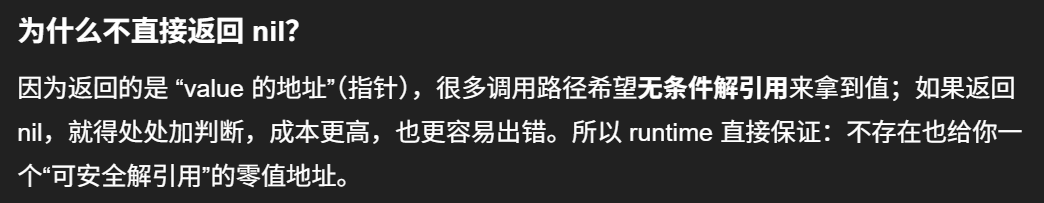 函数返回 h[key] 的指针,如果 h 中没有此 key,那就会返回一个 key 相应类型的零值,不会返回 nil。