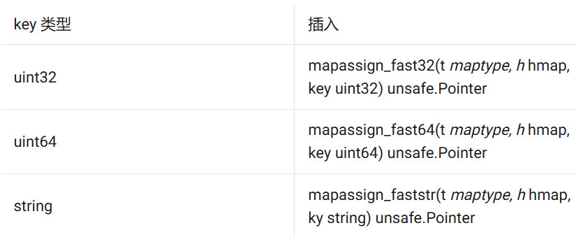 mapassign 有一个系列的函数,根据 key 类型的不同,编译器会将其优化为相应的"快速函数"。