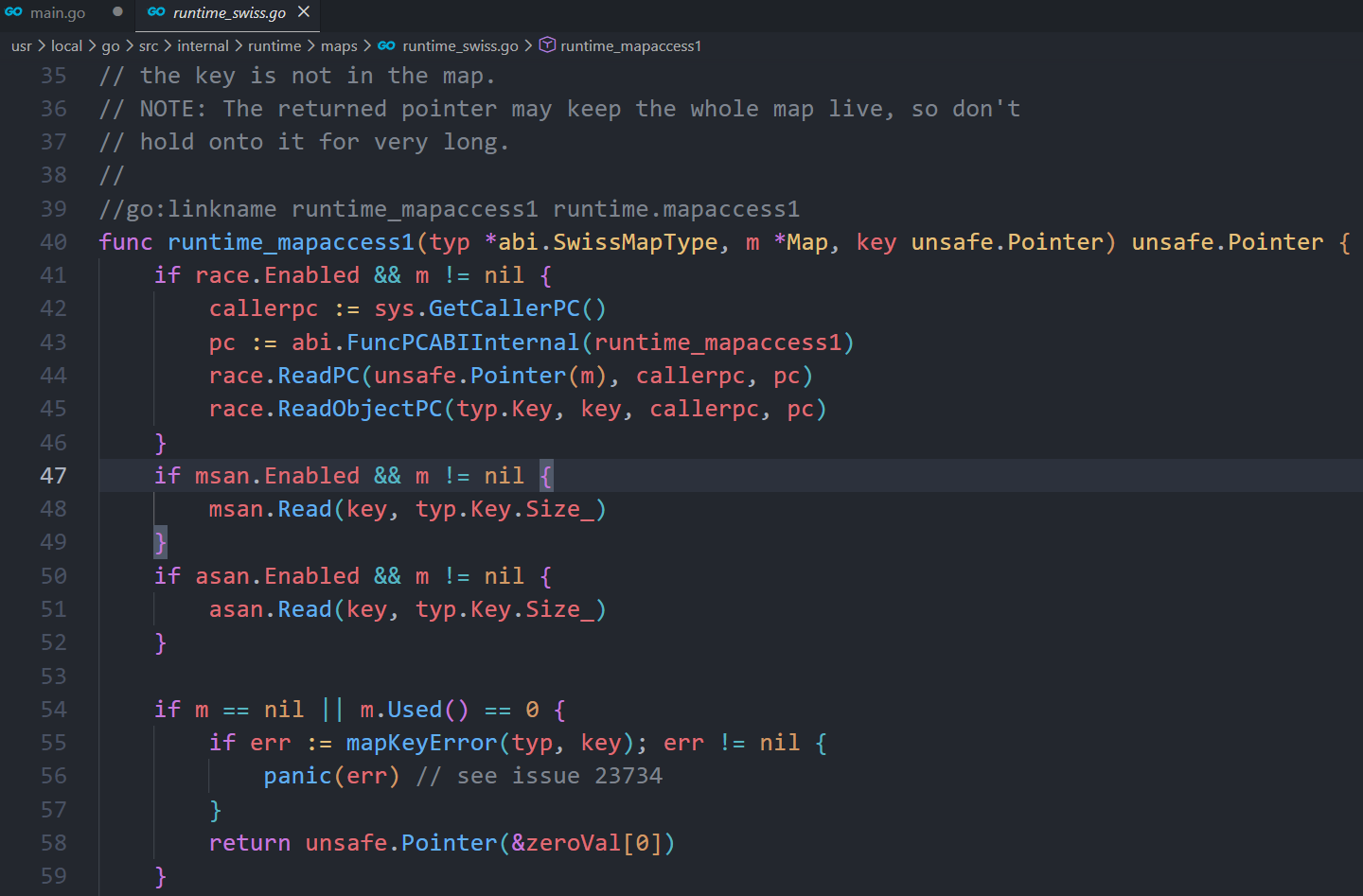 对于 v := map[key] 这种访问方式,在运行时其实调用的 runtime.mapaccess1 方法,源码如下: