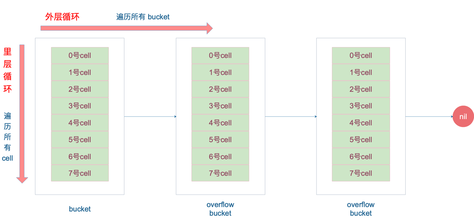 源码大体和之前讲的类似,核心还是一个双层循环,外层遍历 bucket 和它的 overflow bucket,内层遍历整个 bucket 的各个 cell。