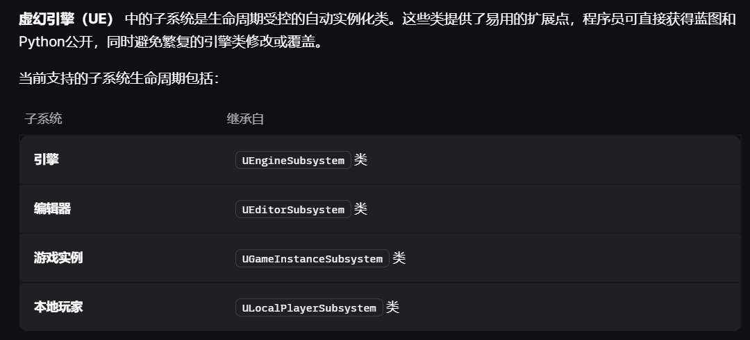 游戏实例子系统 是子系统中的一种,目前用最多。编辑器的更多涉及到编辑器开发。