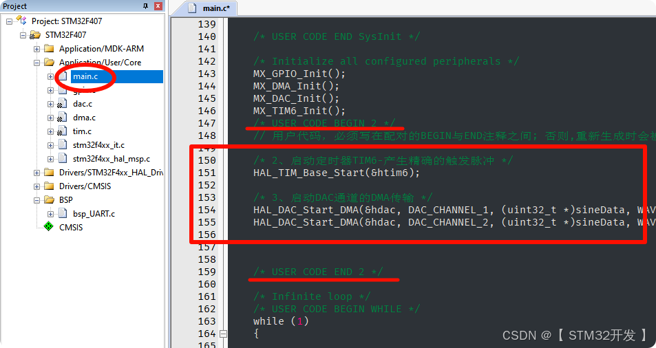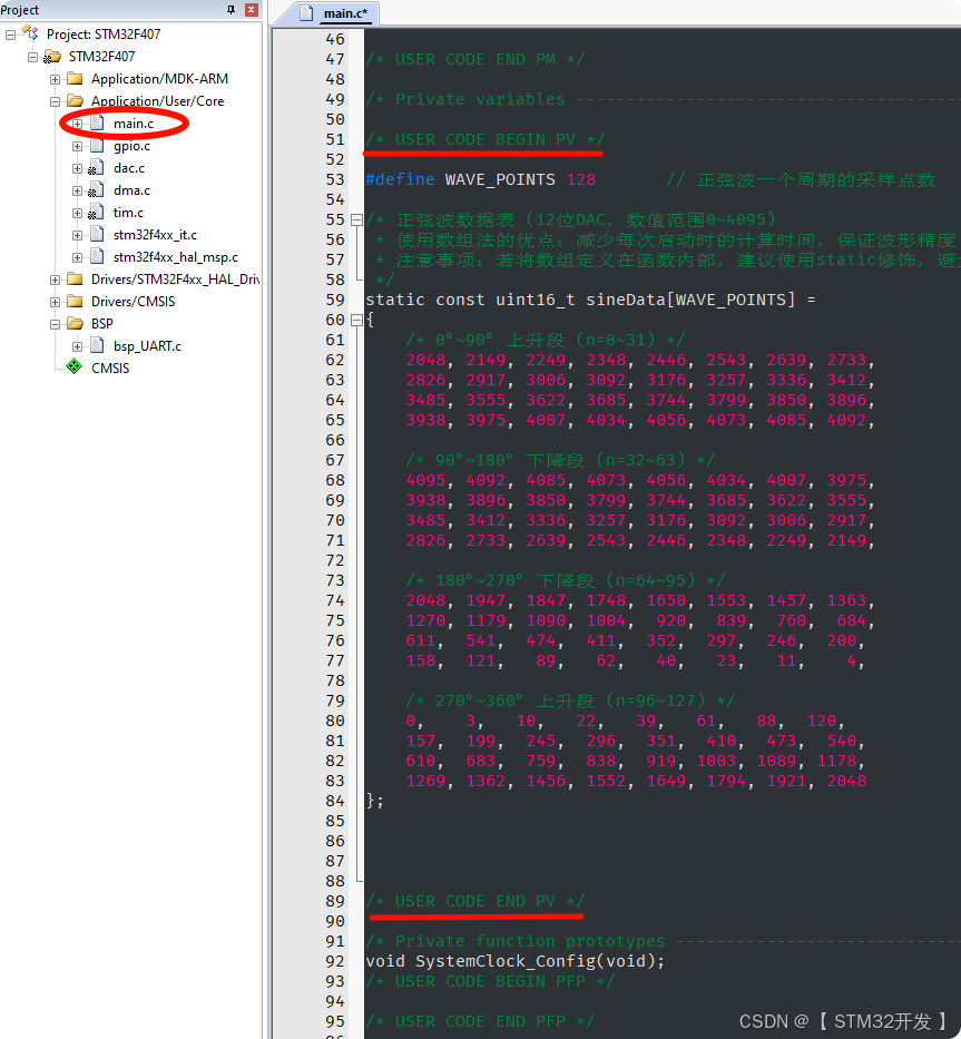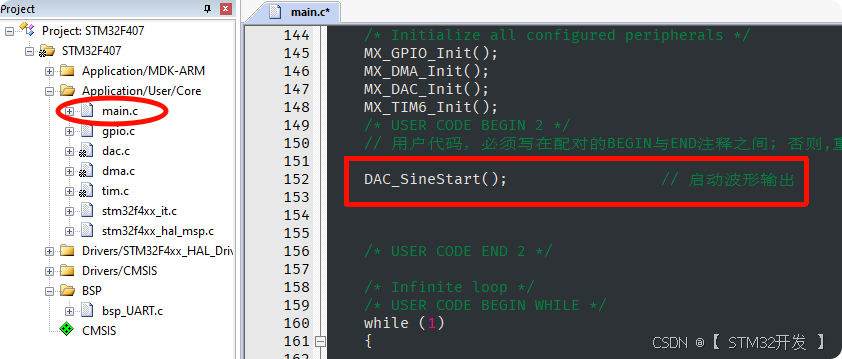 HAL_DAC_Start_DMA(&hdac, DAC_CHANNEL_2, (uint32_t *)sineData, WAVE_POINTS, DAC_ALIGN_12B_R); // 启动DAC通道2的DMA传输,数据输出至PA5引脚