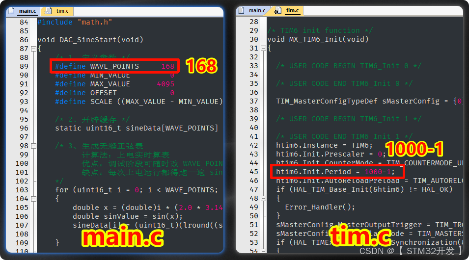 * 2. 波点数的取值,建议根据 TIM时钟频率即值,如84MHz时钟下,取值21、42、84、168等,能令公式整除,以达到精准的波形频率