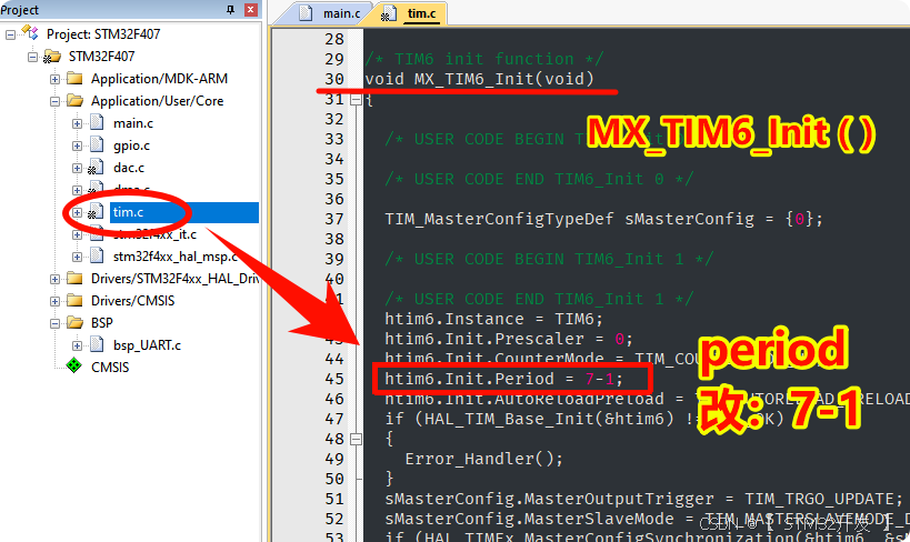 - 代码修改:在keil里双击打开 tim.c 文件,找到MX_TIM6_Init()函数,修改 Period = 7-1