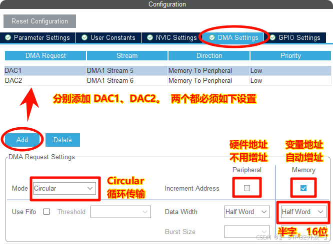 - Peripheral 外设地址:不勾选。DAC数据寄存器是硬件,地址是固定的。