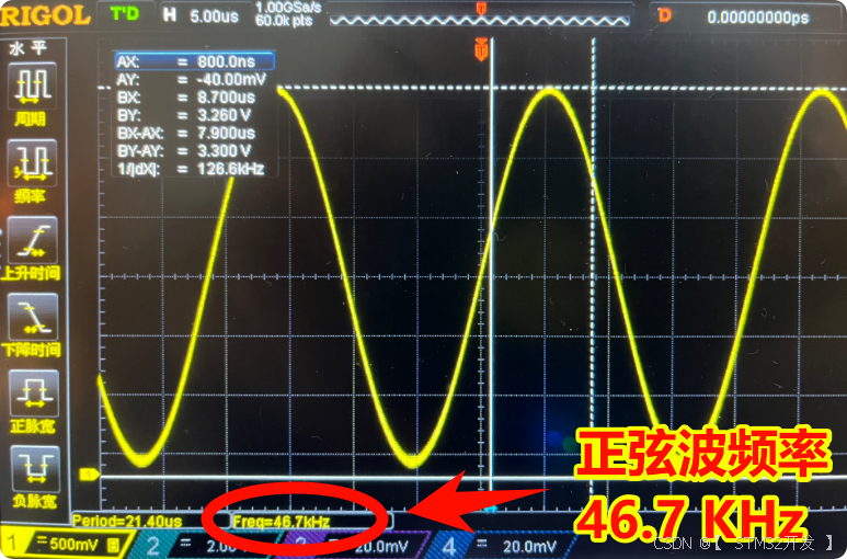 我们将数值代入公式进行计算 (正弦波频率 = TIM时钟频率 ÷ PSC ÷ ARR ÷ 波点数):