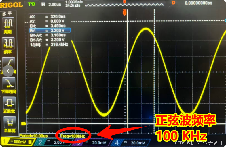 至此,我们已完整演示了从固定数组 到动态计算 、从10kHz 到100kHz 高频挑战及500Hz 低频实现的全过程。通过调整采样点数(N) 与定时器周期(ARR) 的配比,即可灵活生成不同频率与精度的正弦波。