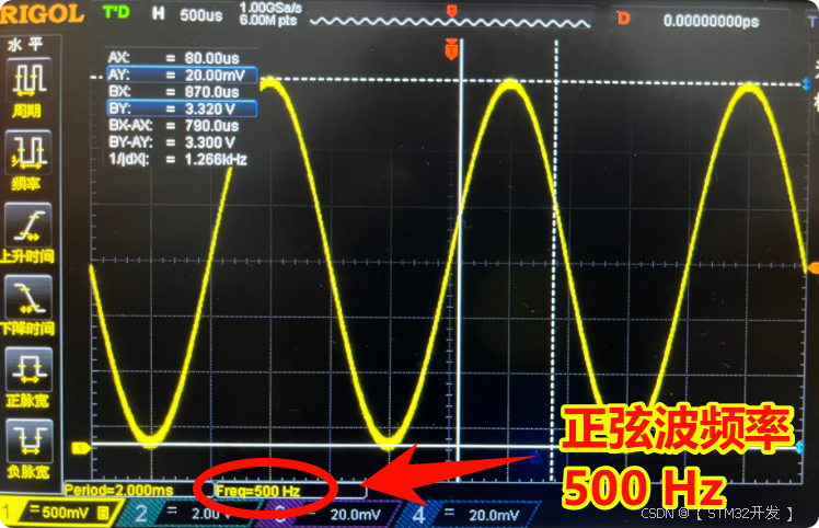 参数计算(TIM6时钟84MHz、PSC=1、波点数168个、波形频率500Hz):