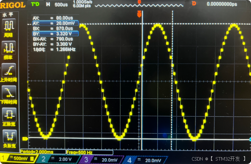 可生成500Hz正弦波,但波形呈明显阶梯状 ,平滑度差。