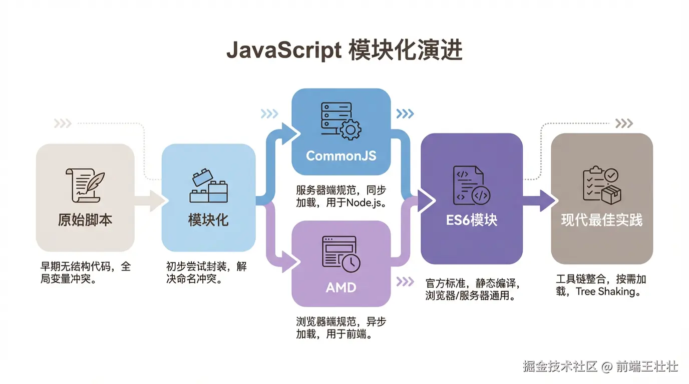 从"茹毛饮血"的 IIFE,到"诸神之战"的 CJS/AMD,再到如今 ESM 的"天下一统"。JavaScript 模块化的演进史,其实就是前端从脚本脚本语言向企业级软件工程迈进的历史。