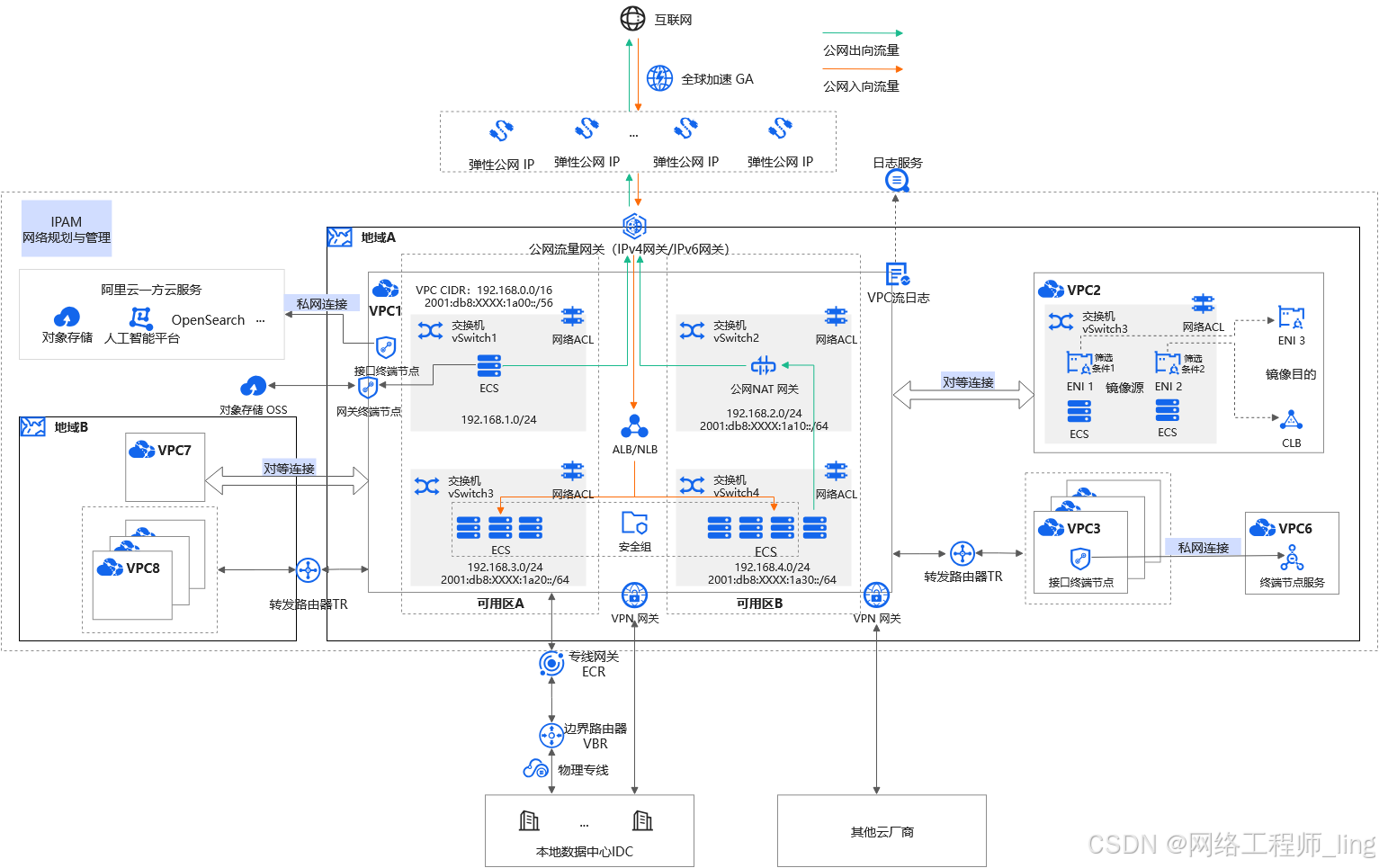 | 网络隔离单元 | VPC(虚拟私有云) | 按业务 / 地域划分资源隔离域,地域 A/VPC1 包含 IPv4(192.168.0.0/16)及 IPv6 网段 |