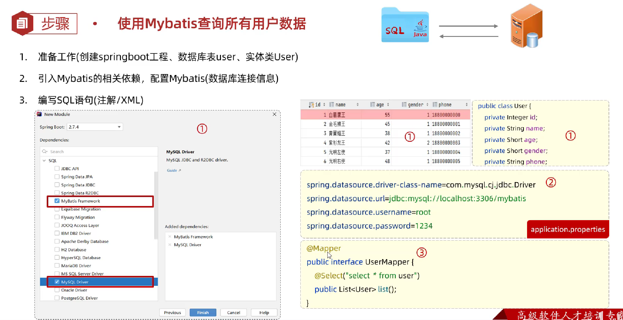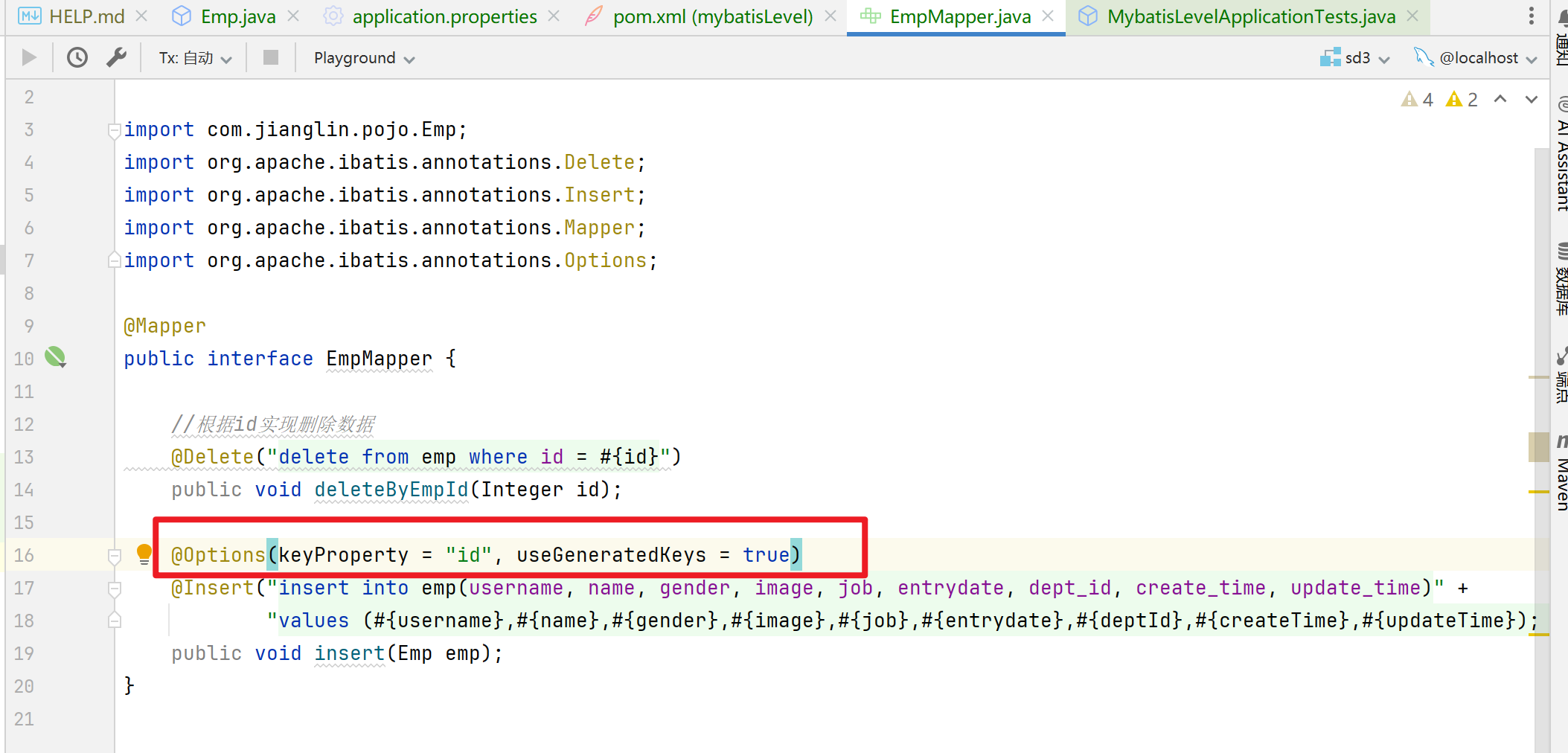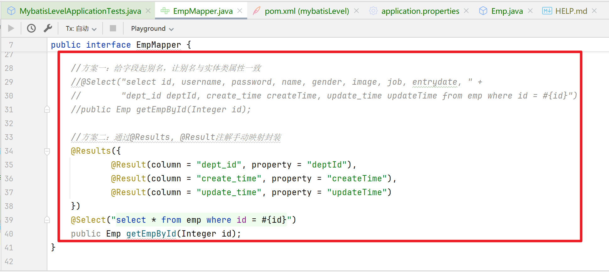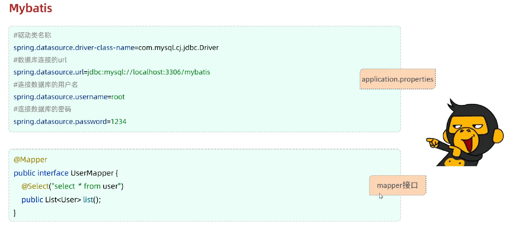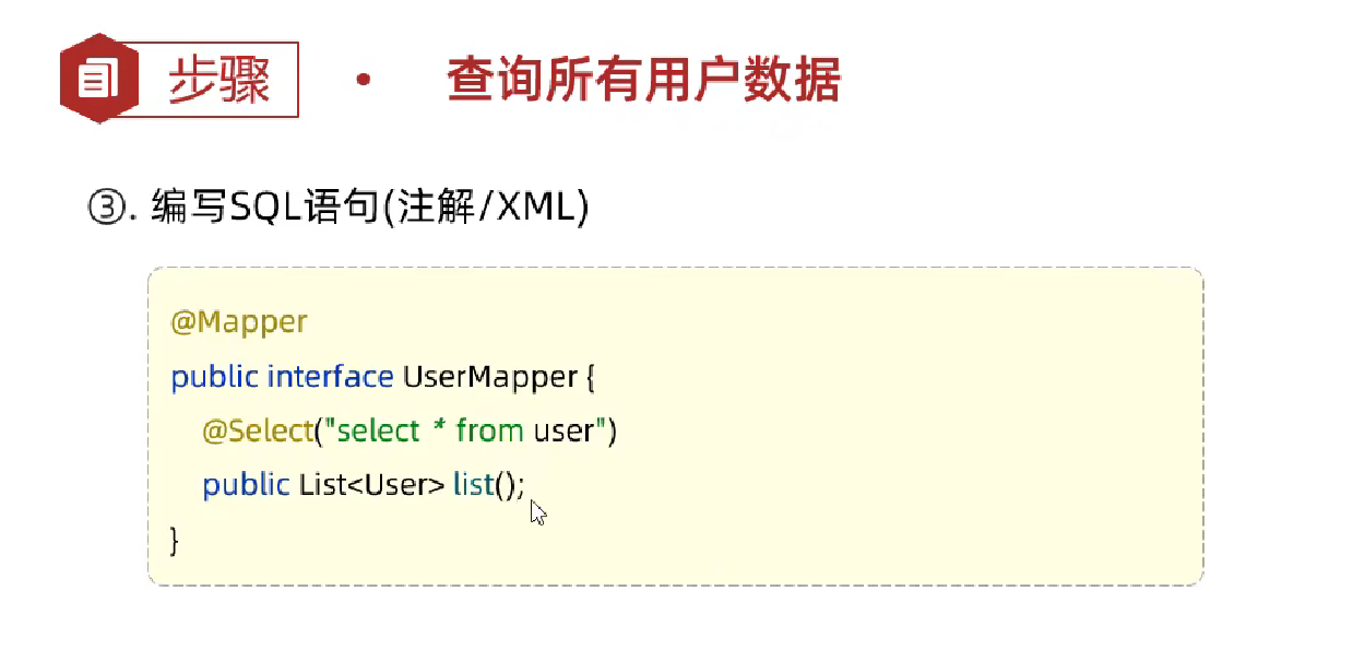@Mapper //在运行时,会自动生成该接口的实现类对象(代理对象), 并且将该对象交给IOC容器管理