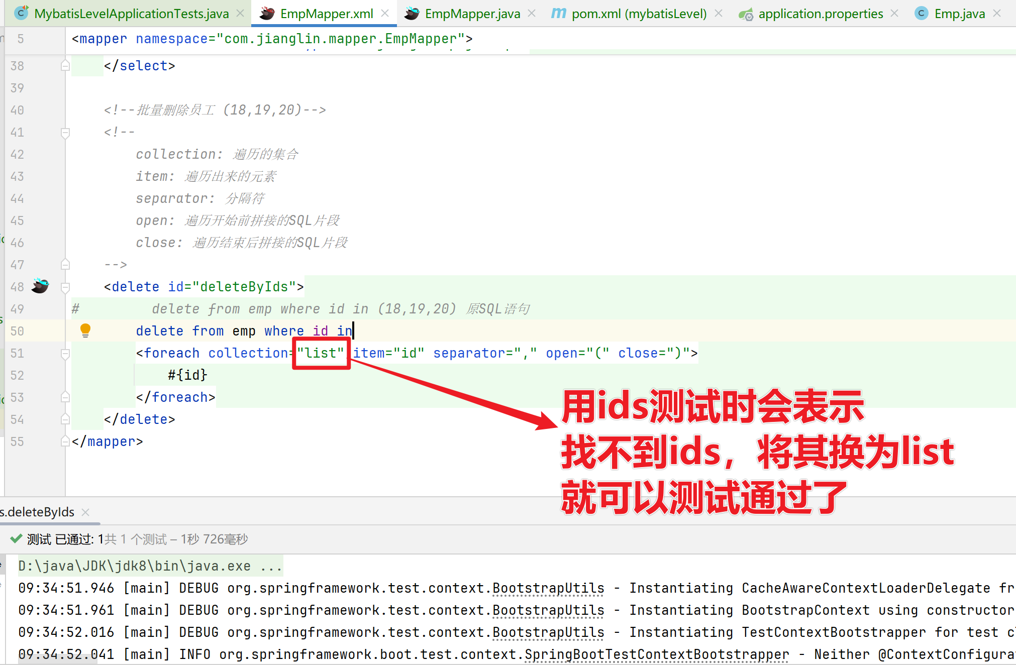 虽然传递的参数名叫 ids,但 MyBatis 在解析时: