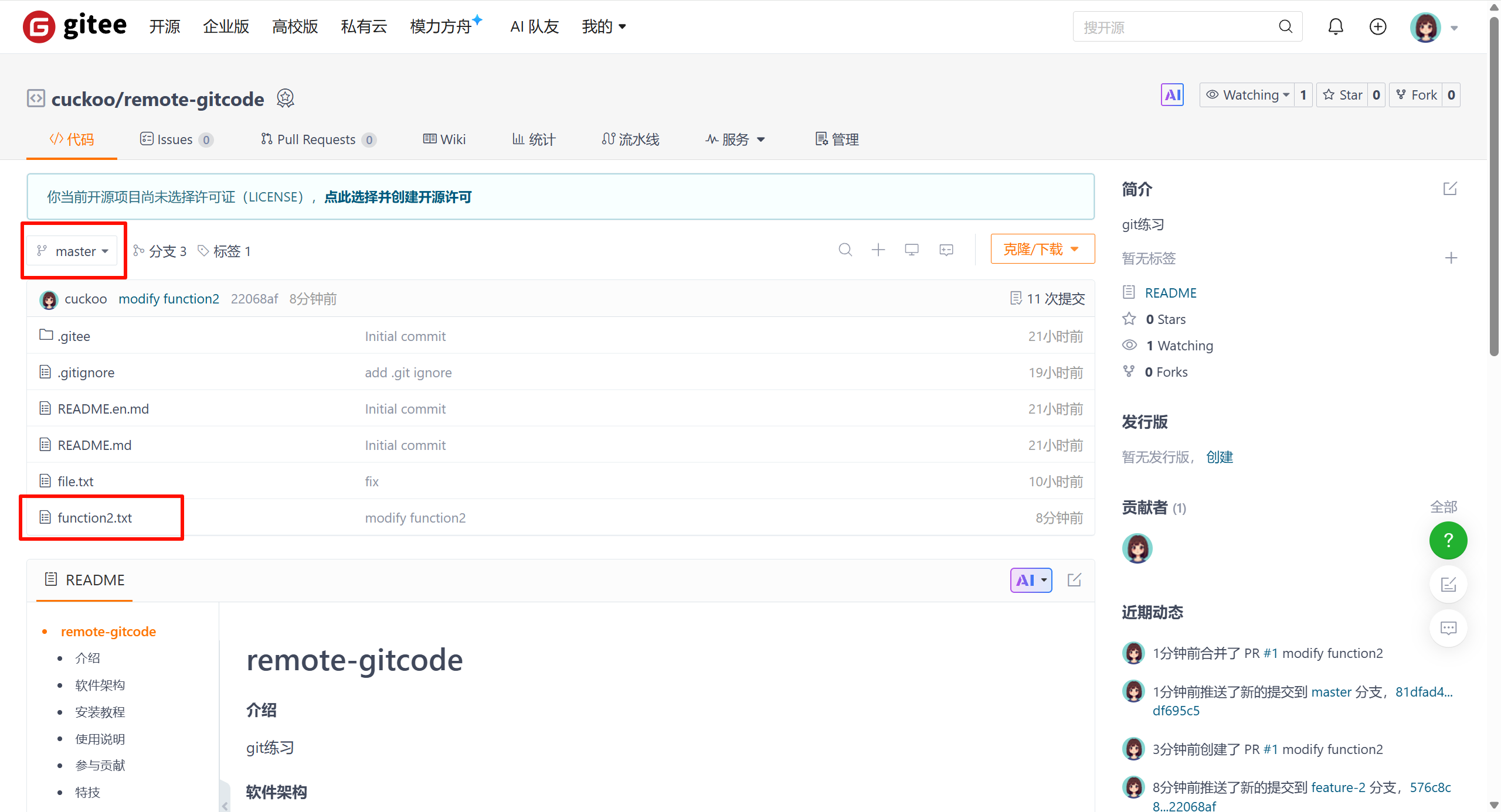 PS D:\code\remote-gitcode> git commit -m "add function2"