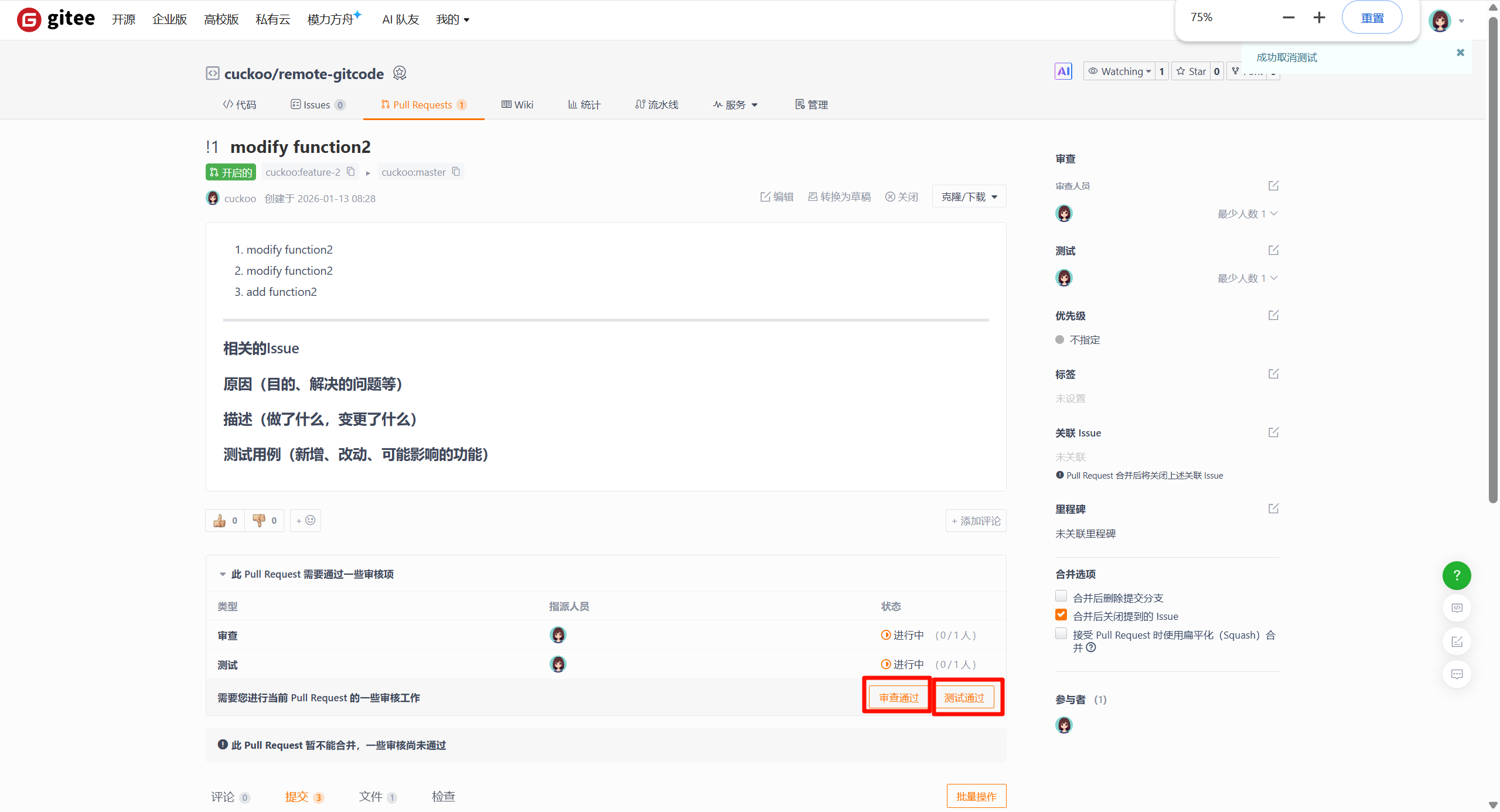 PS D:\code\remote-gitcode> git commit -m "modify function2"