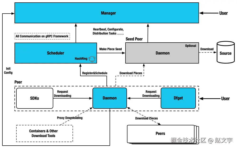 Dragonfly模块为四类:管理器、调度器、种子对等节点和对等节点。