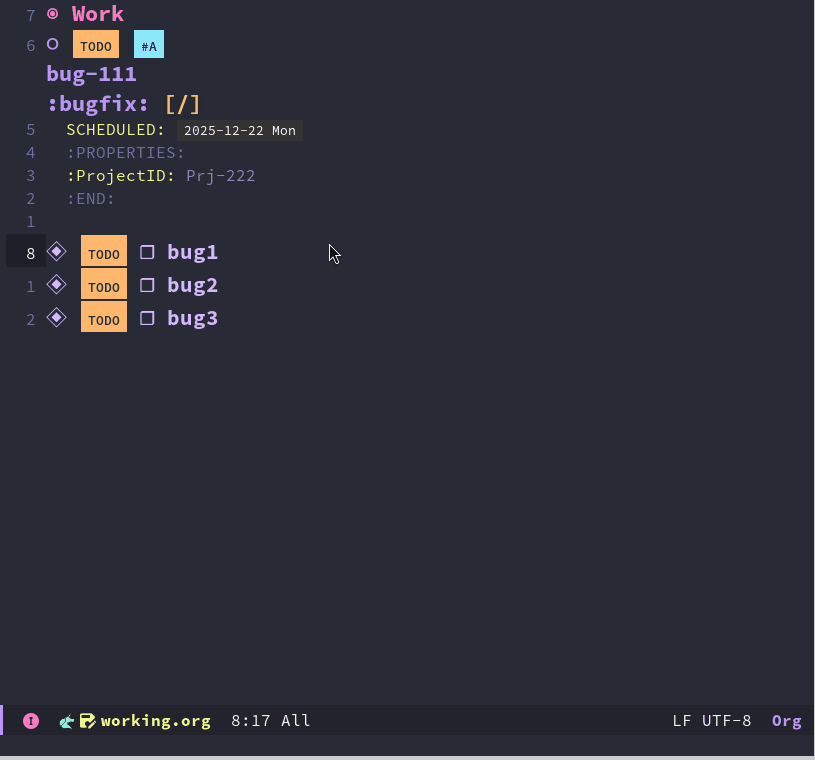 这些可以通过设置属性和标签来描述这些信息。我个人认为它们二者在记录任务的额外信息时没有什么大的区别。主要区别在显示方面,标签一般于TODO 信息展示在一行,而属性默认是被折叠起来的,所以对于一些简要的信息,例如任务目前是谁在处理、开会的地点这类信息我习惯放置到标签上、而属性放置一些不那么重要的信息。