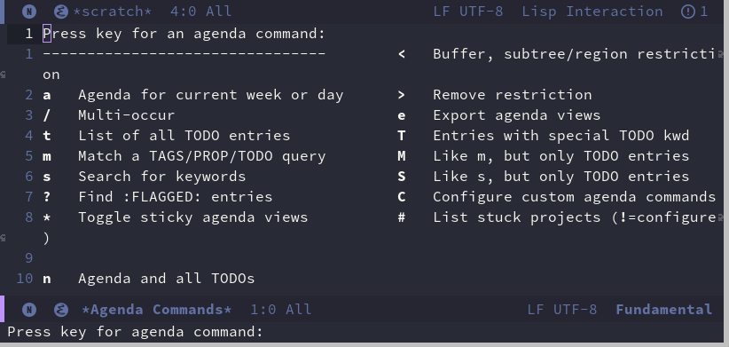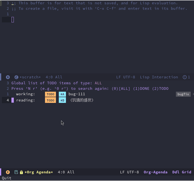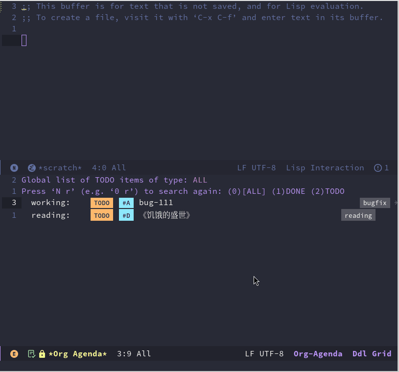 我们在前面的模板中,待办任务前面都是以 TODO 开头,这里的TODO就是org 中待办事项的一个标识。我们可以通过 org-agenda 来查看相关的任务。